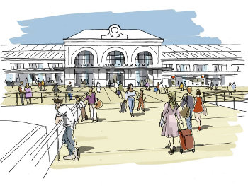 Venant de la place Carnot, le voyageur montera alors une rampe douce jusqu’au premier niveau du pôle d’échanges, un étage en-dessous de l’actuelle entrée, qu’il peut traverser de part en part pour déboucher de l’autre côté sur le futur parvis de la gare. Fini donc les escalators interminables.