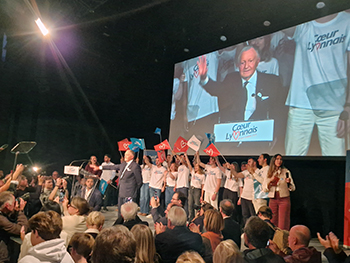 Beaucoup de cheveux blancs donc, aux côtés de quelques dizaines de jeunes en t-shirt blanc, chargés d’ambiancer la salle. Mission largement réussie, puisque des « Aulas, Aulas, 2026 », « Aulas, maire de Lyon » et autres « On va gagner » ont fusé tout au long du meeting, ponctués d’applaudissements nourris et de quelques hués quand il était question de la majorité écologiste.