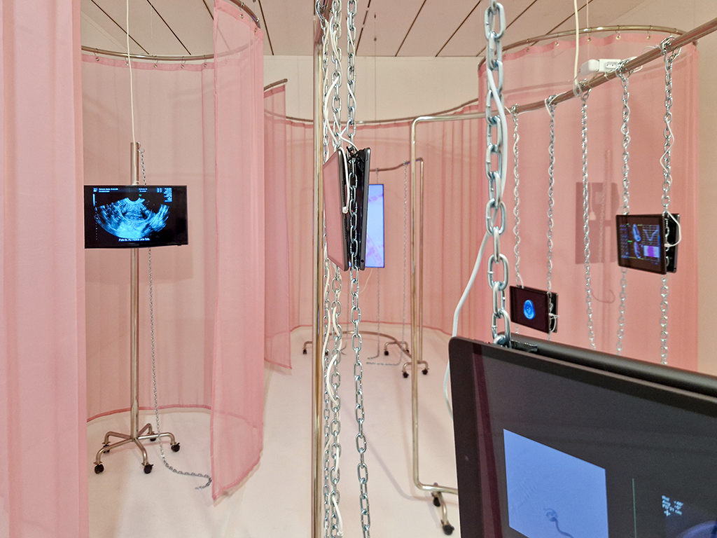 L’installation raconte ses choix et ses refus : appartenance et domination, maternité, anorexie. Elle montre en images comment elle a laissé son corps disparaître jusqu’à presque en mourir, avant de ressusciter. L’art comme thérapie. La création comme moyen de révolte aussi, lorsqu’elle retranscrit les propos acerbes des femmes de sa famille sur son choix de ne pas donner la vie. Une façon de dénoncer des paroles féminines façonnées par des traditions patriarcales et religieuses ; son père et son grand-père étaient prêtres. L’installation vue d’en haut épouse d’ailleurs les contours de la nef d’une église.